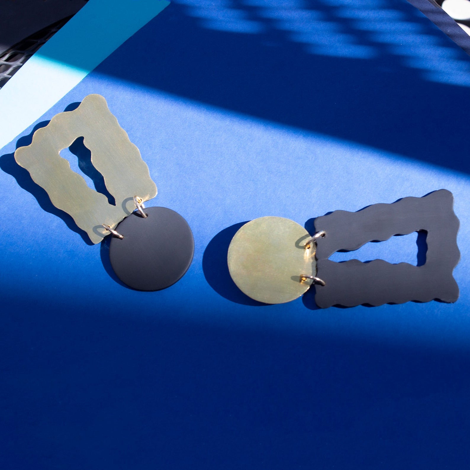 The earrings are made with silver backings, brass, and polymer clay.